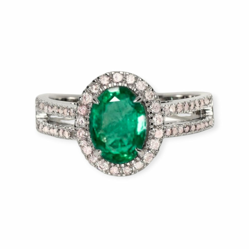 Une bague en or blanc de haute qualité, ornée d'une émeraude ovale d'un vert intense et sertie de diamants étincelants. L'harmonie des couleurs et de la lumière confère à ce bijou une élégance incomparable et un éclat luxueux. Disponible exclusivement chez Mahler Jewelers.