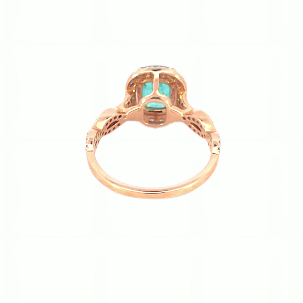 Dieser edle Smaragd-Diamant-Ring aus 14 Karat Roségold besticht durch seine harmonische Komposition aus Farbe, Glanz und exzellenter Formgebung. Im Mittelpunkt steht ein kissenförmig geschliffener, natürlich gewachsener Smaragd von 1.58 Karat – transparent, leicht bläulich-grün und mit einer strahlenden Tiefe, die ein eindrucksvolles Farbspiel offenbart.