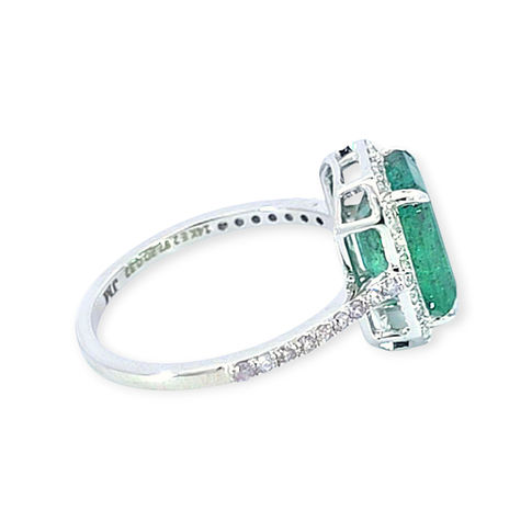 Umrahmt wird der Edelstein von 47 funkelnden, natürlichen Diamanten mit insgesamt 0.32 Karat, die seine Leuchtkraft elegant akzentuieren und dem Ring eine luxuriöse, ausdrucksstarke Ausstrahlung verleihen. Das kühle Weissgold verstärkt die intensiven Smaragdnuancen und unterstreicht die stilvolle Gesamtwirkung dieses kunstvoll gefertigten Schmuckstücks.
